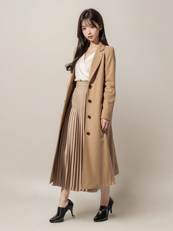 今回ご紹介した冬のコーディネートは、 「ベージュのロングコート」×「プリーツスカート」×「ホワイトトップス」 の組み合わせがポイントです。これに 「ブラックヒール」 を合わせることで、洗練された大人のスタイルが完成します。